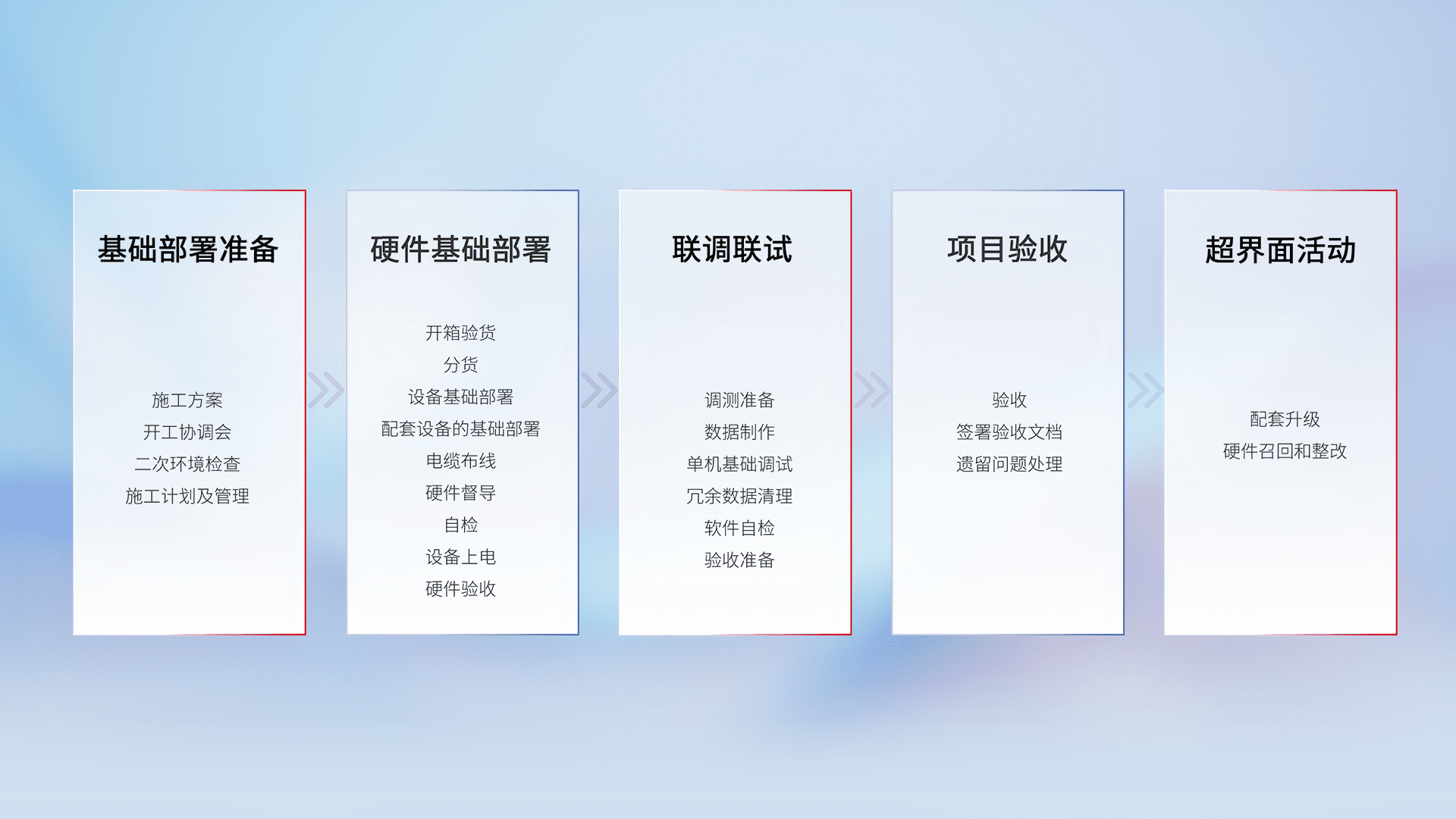 从基础部署准备、、、硬件基础部署、、、联调联试、、、、项目验收、、、、越界面活动的全过程可追溯,,保证施工质量和进度。。